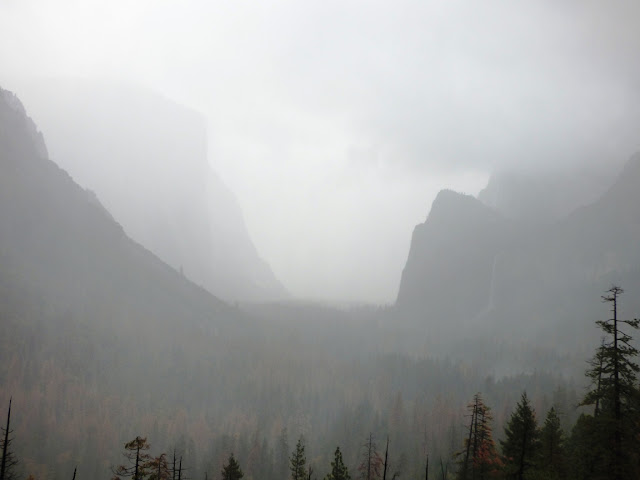 It's a given that if one schedules a field trip and reserves a bus months in advance that the weather is going to be a wild card. And it was definitely wild. The weather forecasts all week pointed to a 100% chance of rain essentially all day, and as we left town, the rain was indeed falling. All the way up the hill, all the way into the valley. I gave lectures from the bus, watching water pour out of the sky. I had 30 students, some of whom were expecting to see Yosemite Valley for the first time in their lives. I was clenching my teeth, worried that we would arrive in the valley and the walls would be hidden behind the clouds. We arrived at Tunnel View, and I was slightly relieved to see that the cliffs were just barely distinguishable through the rain squalls (see the top picture). At least we could say that we saw something. We got back into the bus, to go make more stops in the rain. Then something wondrous happened.