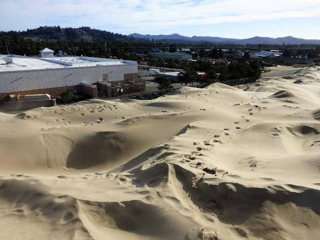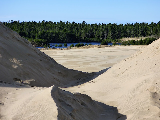 In our last post, we had a look at the "carpeted" dunes of Florence, the ridges of wind-blown sand along the coast that have been "stabilized" by invasive European Beach Grass. The grass was planted in the 1920s and has spread from California to British Columbia. It's a real problem, and huge changes have taken place in the geography of the dune environments along the west coast, especially at Oregon Dunes National Recreation Area.